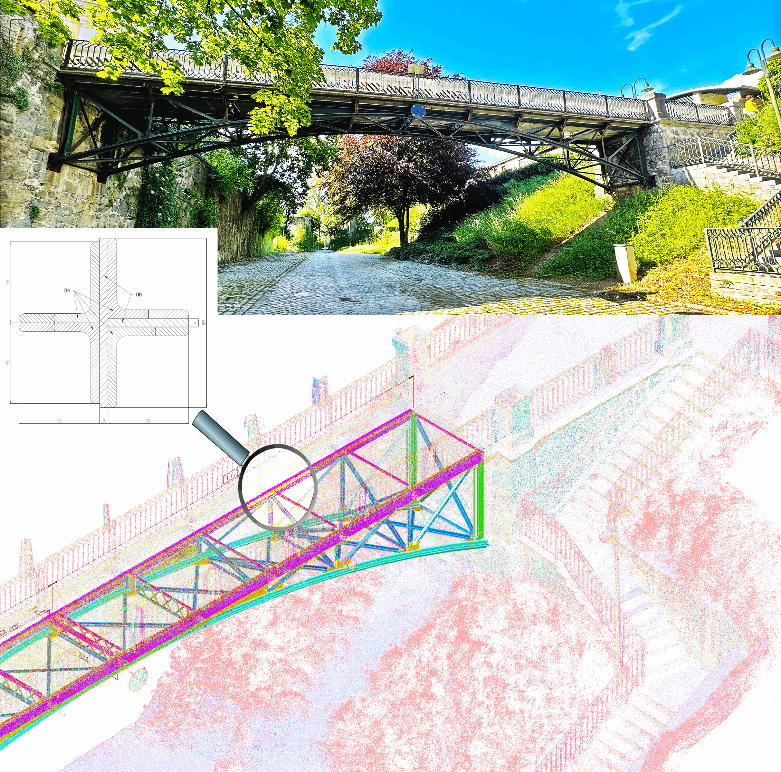 Die Aufgabe umfasste das präzise 3D-Laserscanning einer denkmalgeschützten Brücke, die aufgrund ihrer schwierigen Zugänglichkeit nur mit besonderem Aufwand erfasst werden konnte. Auf Basis der gescannten Daten wurde ein detailliertes Drahtmodell erstellt, das als Grundlage für nachfolgende statische Berechnungen dient, um die strukturelle Integrität der Brücke zu überprüfen und eventuell notwendige Maßnahmen zu planen.
