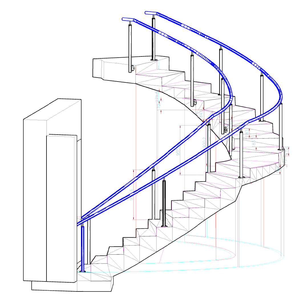 Im Rahmen dieses Projekts wurde mittels Laserscanning eine exakte 3D-Punktwolke der baulichen Gegebenheiten erstellt. Auf Basis dieser hochgenauen Vermessung erfolgte die detailgetreue Planung einer maßgefertigten Wendeltreppe. Die präzisen Daten ermöglichten eine konstruktive Ausarbeitung ohne Maßabweichungen und bildeten die Grundlage für eine effiziente Fertigung und Montage.