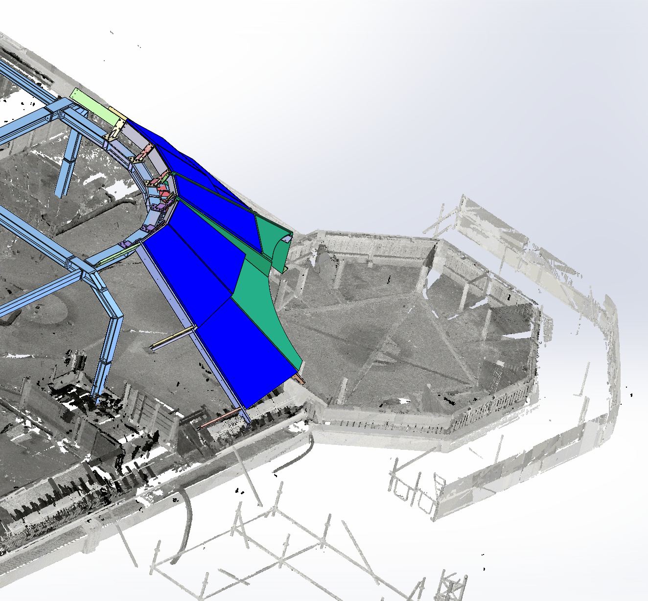 Für die präzise Sanierungsplanung wurde die Glas-Pyramide mit einer hochgenauen 3D-Laser-Vermessung erfasst. Der aus den Scandaten erstelle digitale Zwilling ermöglichte eine detaillierte Planung und die Optimierung der Sanierung. Durch die exakte Vorfertigung der Unterkonstruktion konnte die Montagezeit deutlich verkürzt werden.